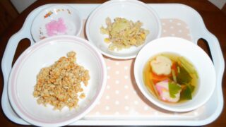 3月3日 この日の給食は、「鶏そぼろ(丼)、花でんぶ、キャベツとツナのさっぱり和え、花麩のすまし汁」でした(ひなまつりスペシャルメニューです)。 この日は桃の節句。平島幼稚園でもみんなでひなまつりを楽しみました。 年長さんが遊戯室に飾ってく...
