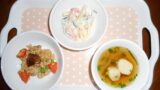 4月22日 この日の給食は、「鶏肉のごまみそ焼き、竹輪と人参のきんぴら、かきたま汁」でした。